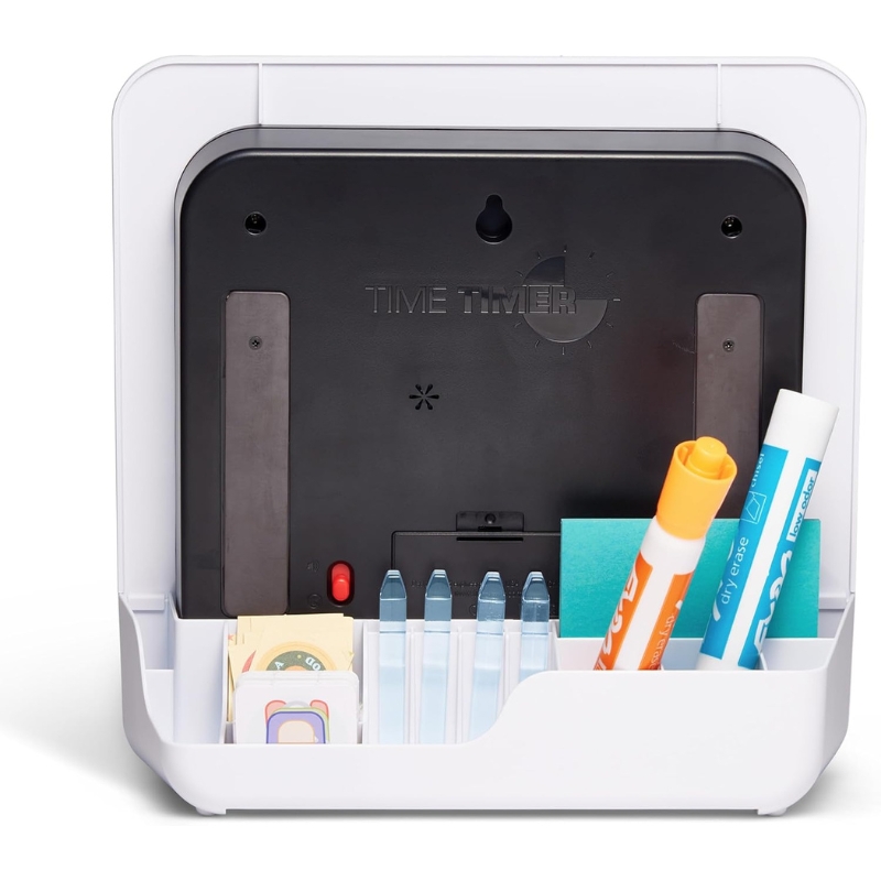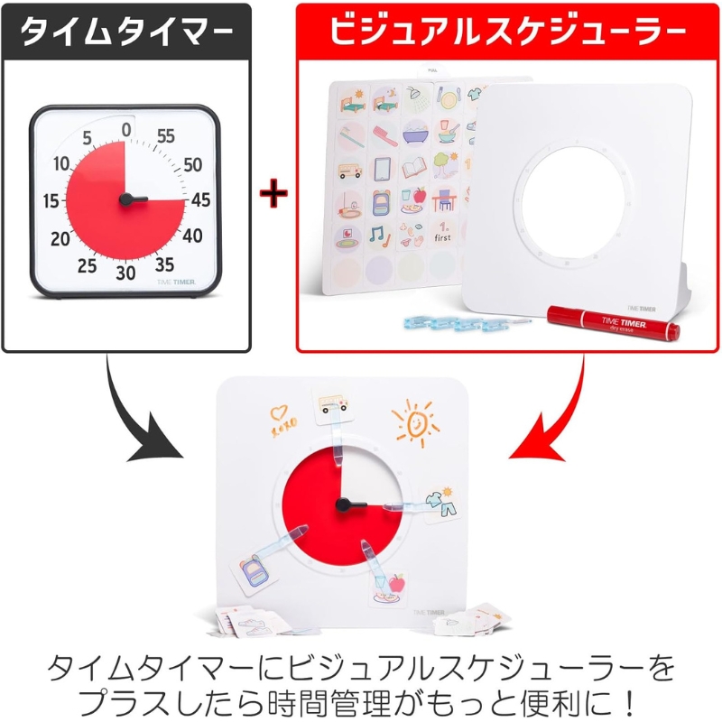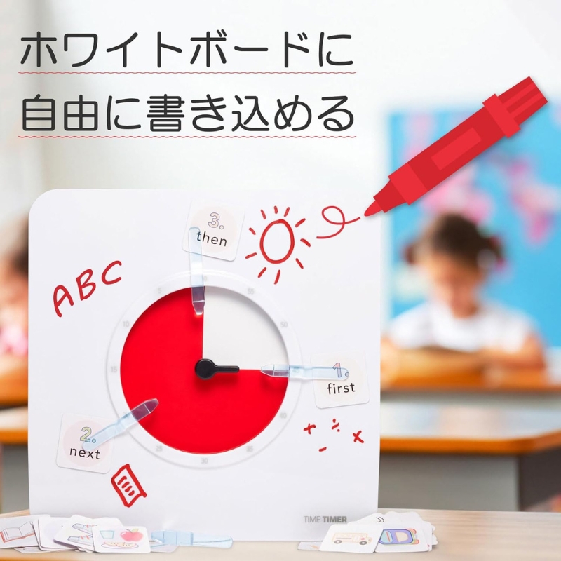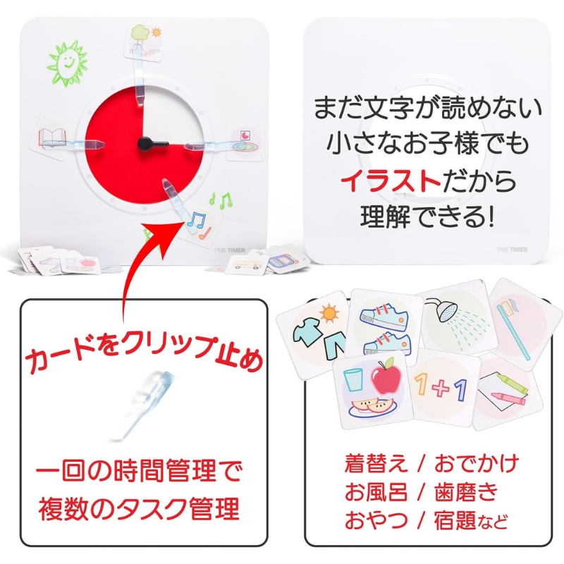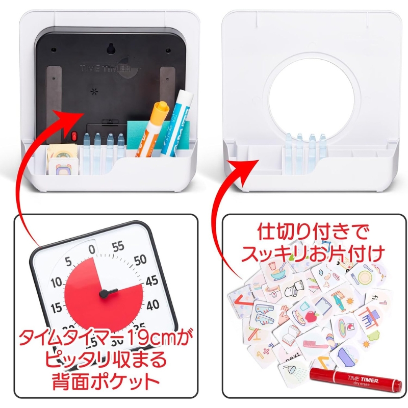 使い方は簡単。中央のつまみを回すだけで時間設定でき、色の減少で残り時間がひと目で分かります。アラームON時は音でお知らせ。ホワイトボードにアクティビティカードや書き込みを組み合わせることで、複数のタスクを分かりやすく管理可能。イラスト付きカードで小さなお子様でも直感的に理解でき、生活習慣や学習のサポートに役立ちます。静音設計で集中しやすく、やさしいアラーム音や簡単操作も魅力。背面収納付きで整理もしやすい便利な知育タイマーです。