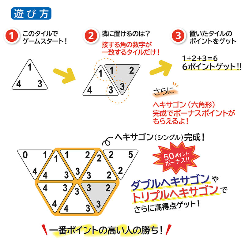 数字の合計の通常ポイントとは別に、タイルを並べてヘキサゴン(六角形)を完成させるとボーナスポイントをゲットできます。