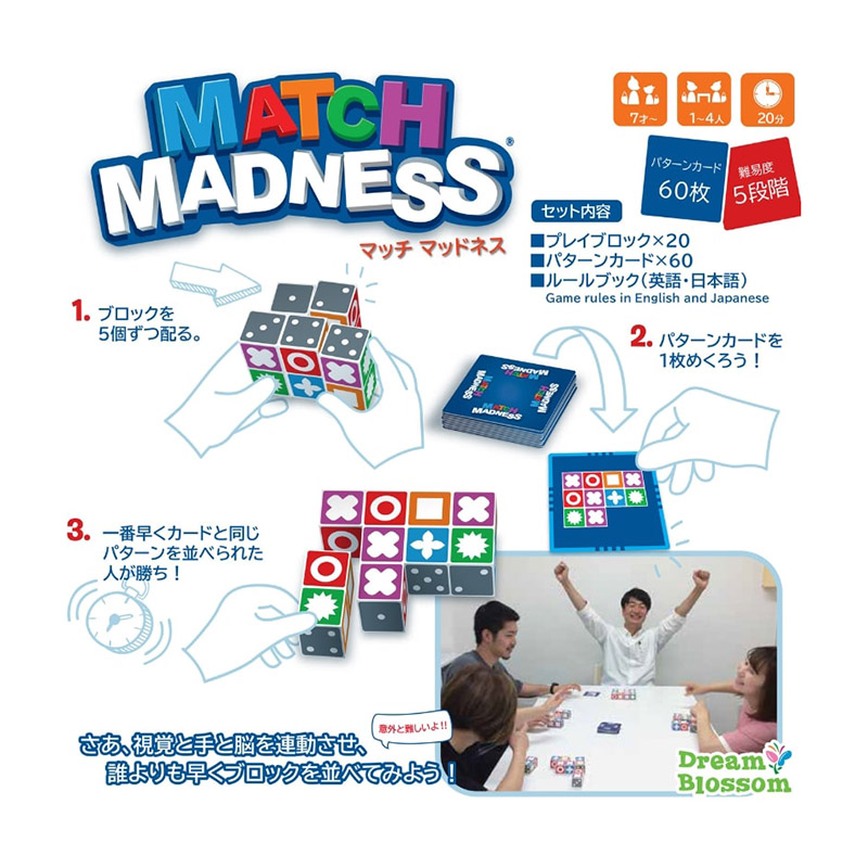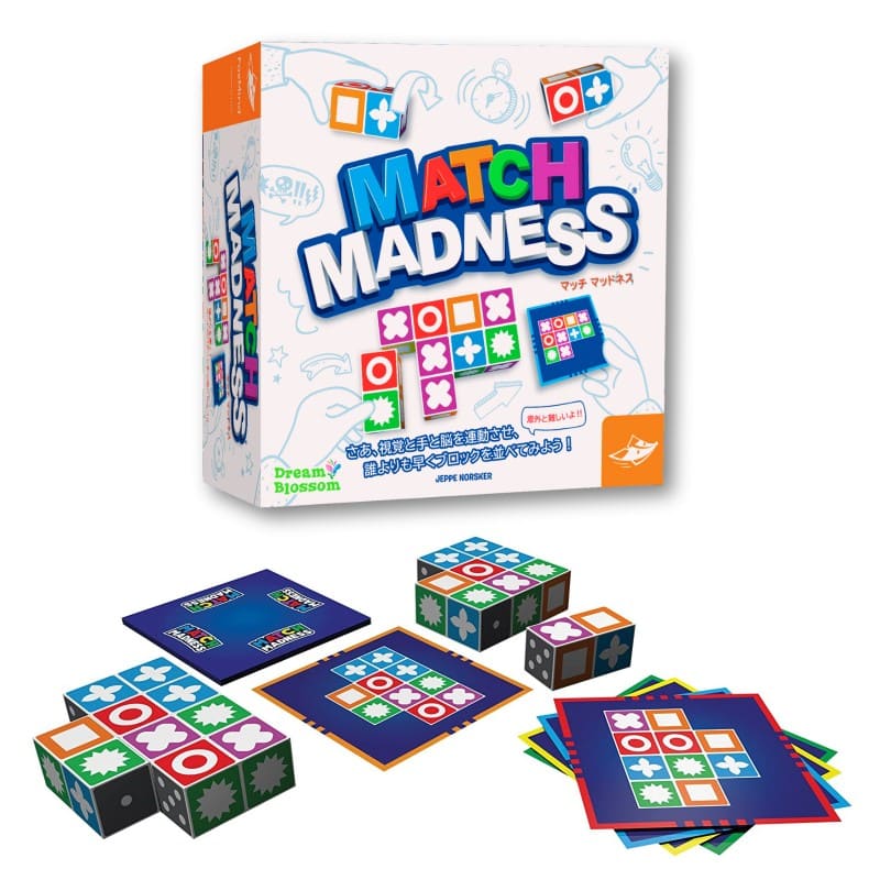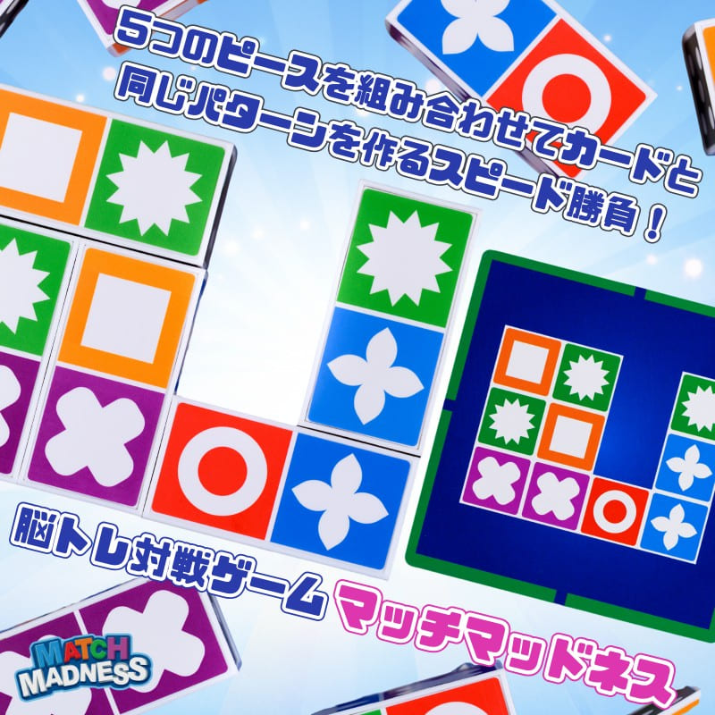 Match Madness (マッチマッドネス)は、シャッフルしたカードの山から1枚ずつカードを裏返し、カードと同じパターンのブロックを対戦者より早く作る対戦型ゲームです。