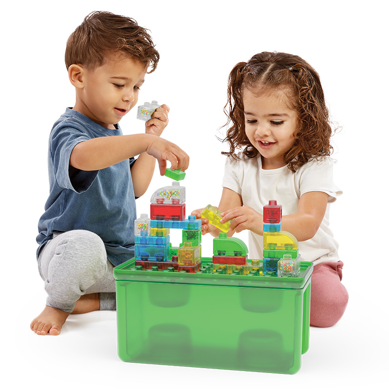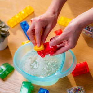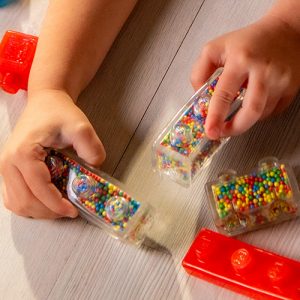 やわらかいブロックの中に砂やビーズなどのいろいろな素材が入っていて、ブロック遊びの楽しさだけでなく、触感の違いを楽しみながら子どもたちの感覚を育むことができます。