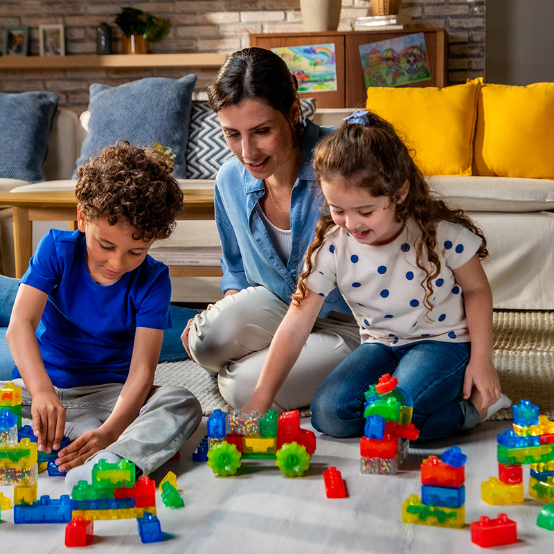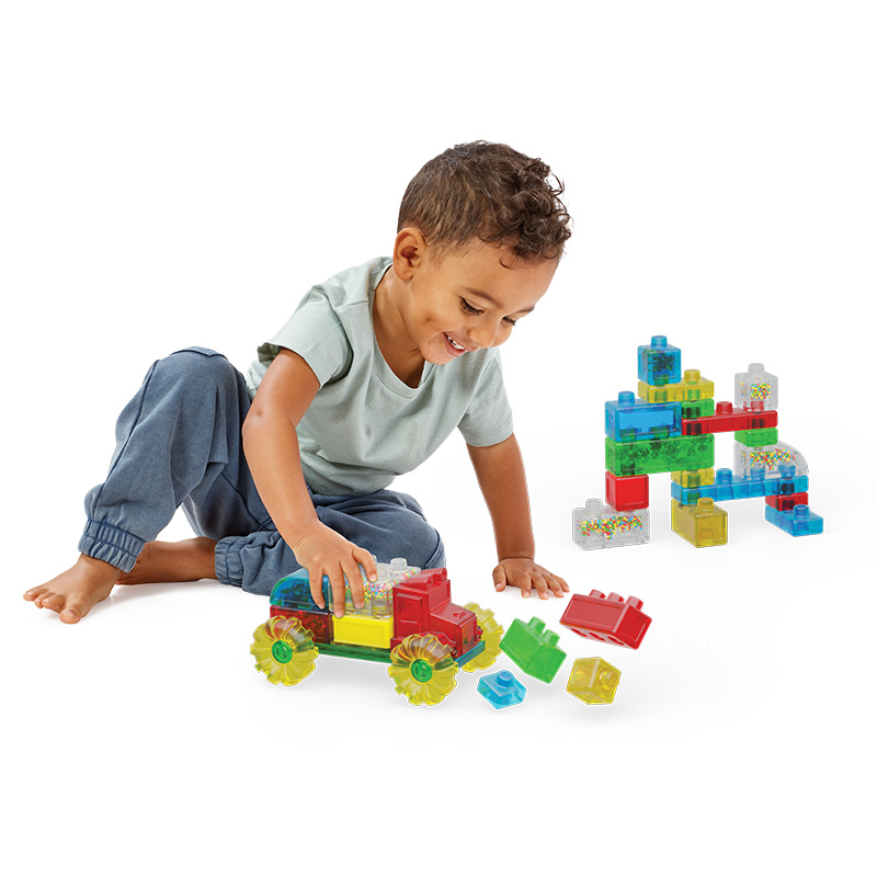 やわらかいブロックの中に砂やビーズなどのいろいろな素材が入っていて、ブロック遊びの楽しさだけでなく、触感の違いを楽しみながら子どもたちの感覚を育むことができます。