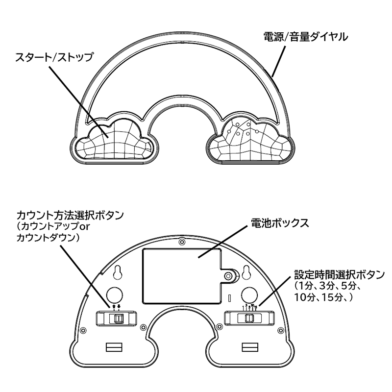 ④正面の左側の雲を押すと、音が鳴り虹が1回点滅してタイマーが開始します。終了すると再度音が鳴ります。タイマー中に雲を押すと、一時停止/再開ができます。