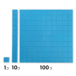 はじめに、単体キューブが1とすると、棒ブロックは10個のキューブ、平らなブロックは100個のキューブでできていることを説明してください。