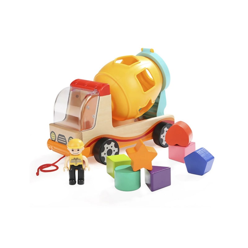 ぐるぐるミキサー車の型はめパズル(Discovery Mixer Truck with Shape Sorter) は、引っぱって遊べるプルトイと型はめパズルがひとつになった知育玩具です。