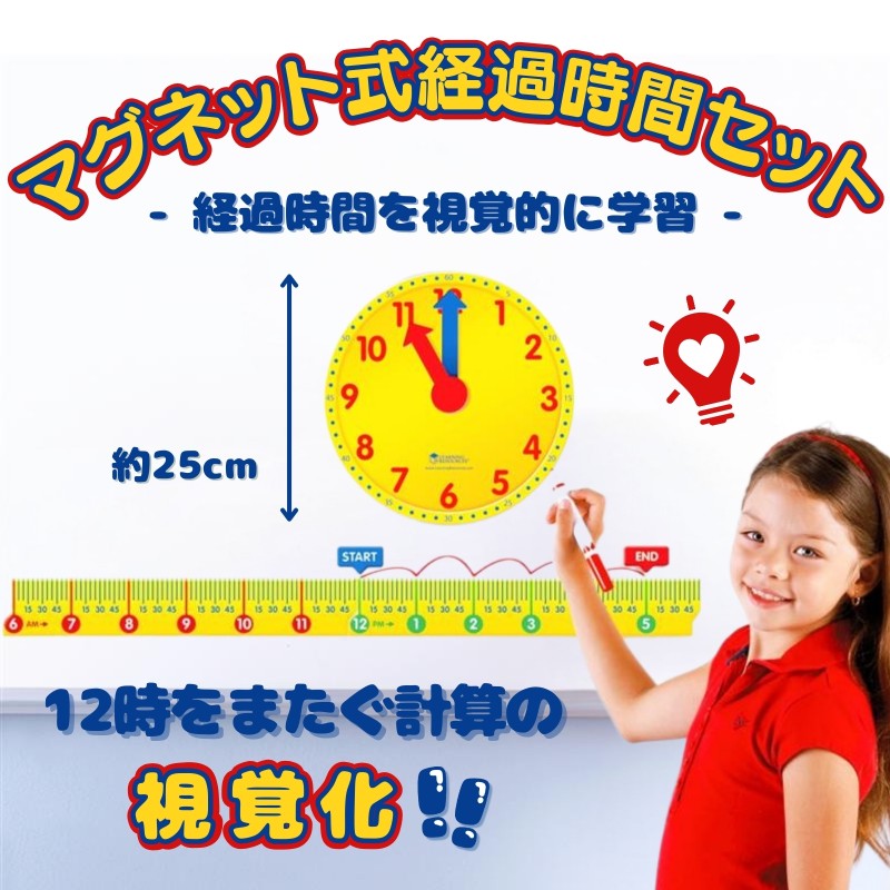 世界100カ国以上で愛されるラーニングリソーシズ(Learning Resources)社の「マグネット式経過時間セット(Magnetic Elapsed Time Set)」は、お子さまの「わかった!」を引き出す優しい学習ツールです。算数の中でもちょっぴり難しいと感じるお子さまが多い「時間の計算」も、このセットがあれば見て、触って、楽しくマスターできます!