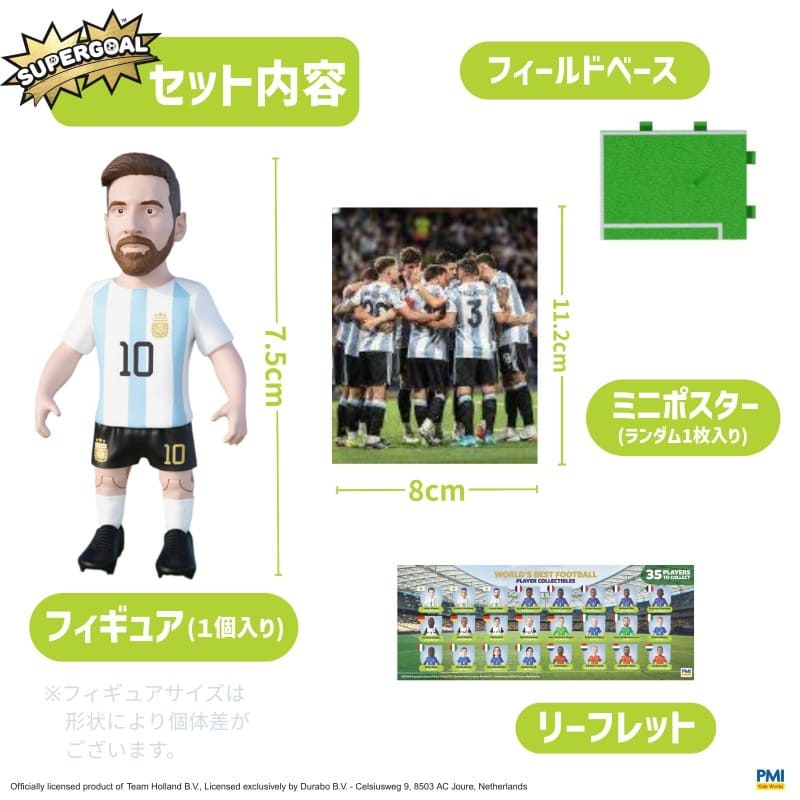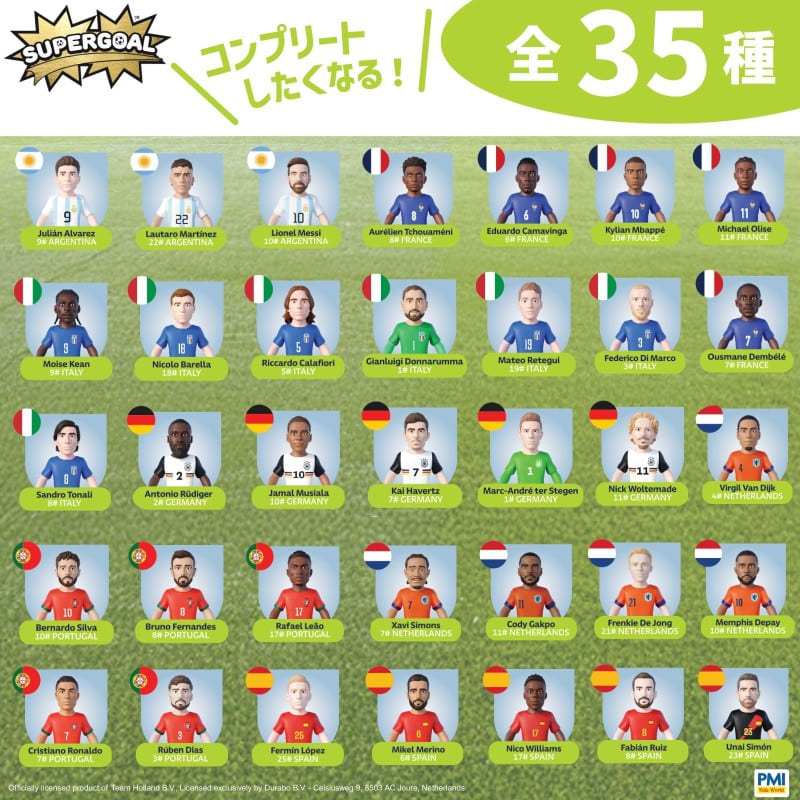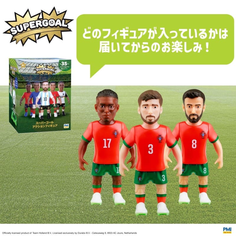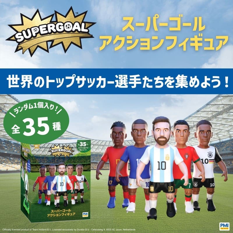 PMI Kids World (ピーエムアイ・キッズ・ワールド) の「スーパーゴール アクションフィギュア」は、2026年北中米W杯に向けた、世界の人気代表チームのトップ選手をフィーチャーした約7.5cmサイズのフィギュアです。
