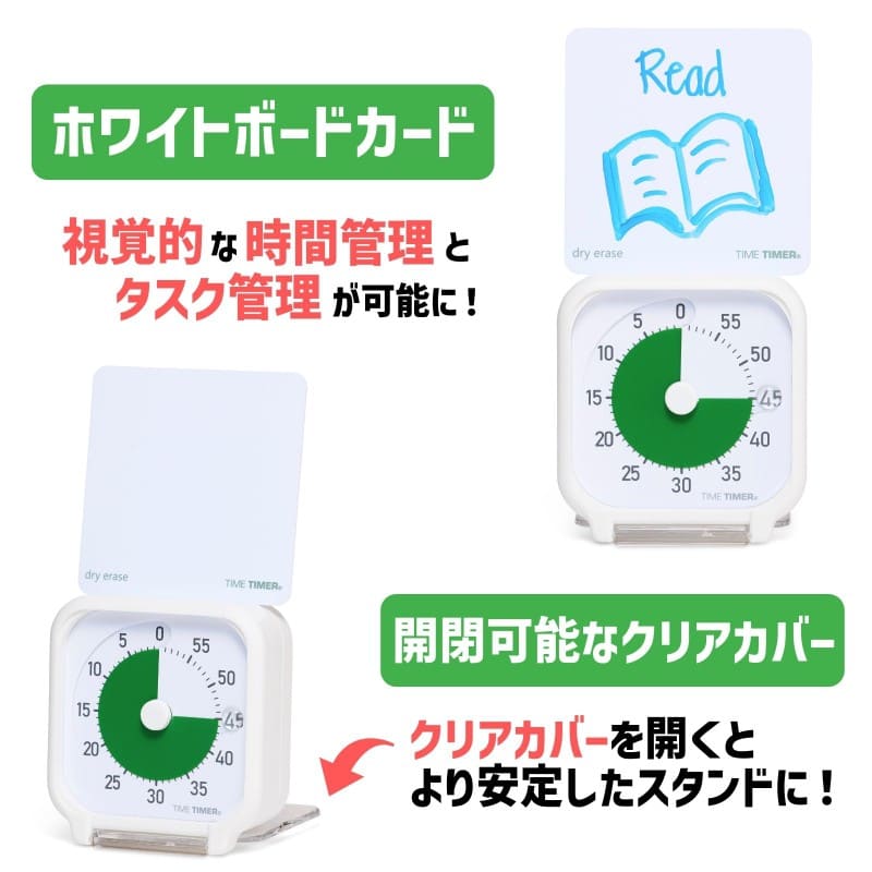 本体上部にセットして使用する書いて消せるホワイトボードカードも付属しており、視覚的にスケジュール管理やタスク管理を行うことができます。